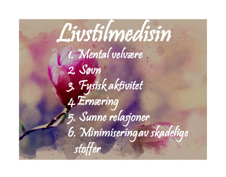 Som bildet viser består livsstilsmedisin av 6 pillarer, der definisjonen til livsstilsmedisin er som følger: